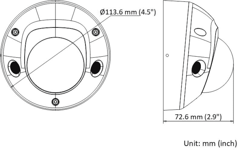 The camera is housed in a compact mini dome form factor measuring 113.6mm in diameter and 72.6mm in height, with IP67 dust and water resistance and IK08 vandal resistance as standard. Operating temperature range is -30 degrees C to 60 degrees C, making it suitable for a wide range of indoor and outdoor installation environments. Power is supplied via PoE (802.3af, Class 3) or 12 VDC.